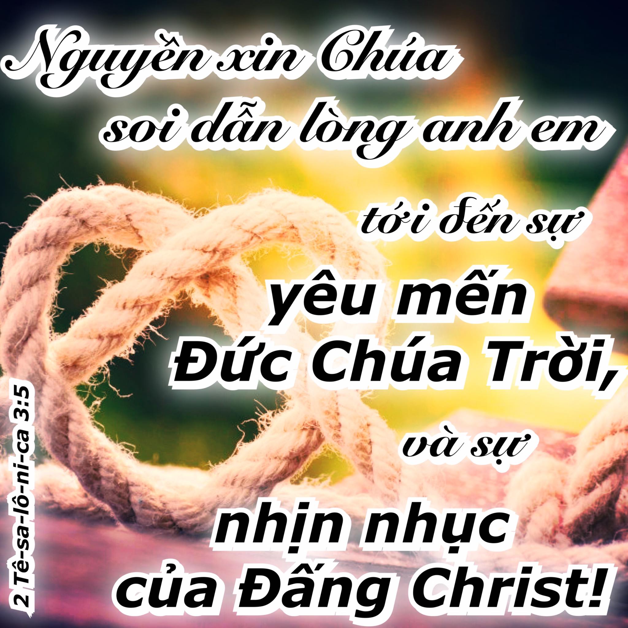 Cầu nguyện: Lạy Chúa, con rất vui vì Ngài có thể giải quyết tất cả các nút thắt của con, và để cuộc sống của con được thành công. Xin Chúa giúp con bền bỉ và kiên nhẫn trong khi Ngài vẫn đang luôn hành động trong cuộc sống của con. „Nguyền xin Chúa soi dẫn lòng anh em tới đến sự yêu mến Đức Chúa Trời, và sự nhịn nhục của Đấng Christ!“ ‭‭2 Tê-sa-lô-ni-ca‬ ‭3:5‬